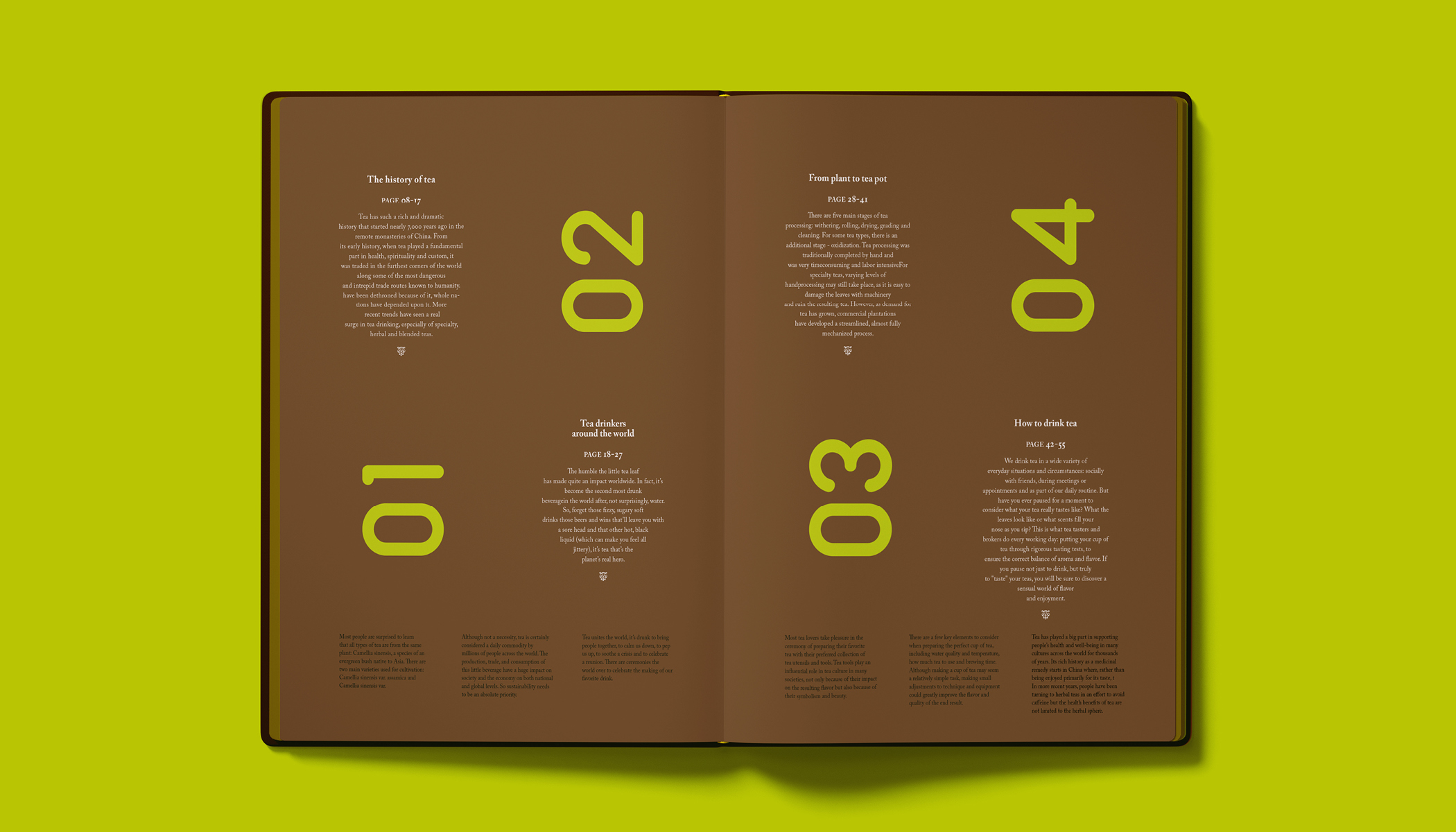 I chose the topic of tea. This design let more people know about the tea and culture of tea and tells them how to better enjoy a cup of tea. Growing it, making it, drinking it, the history, and lots more. The book will take the audience to take a visual journey, starting from the tea leaf. They will see what happens during the processing as well as learn about the different types of tea, and what each needs to bring out its very best in terms of taste. I choose brown, yellow and green as the theme color, as they are closer to the tea itself. Through the combination of illustrations and photos, I try to make people immerse in the topic of tea and deepen their impressions about tea.